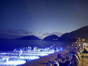 当日は、夜の富海海水浴場が虹色のライトアップとキャンドル、ランタンの灯りに包まれ、幻想的な雰囲気に。